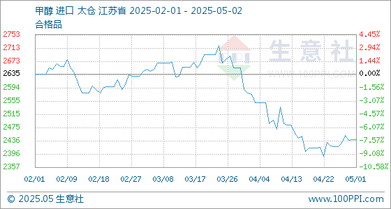 5月2日,生意社甲醇基准价为2440.00元/吨,与本月初持平。