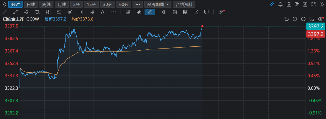 COMEX黄金期货主力合约也明显拉升,冲击3400美元关口。