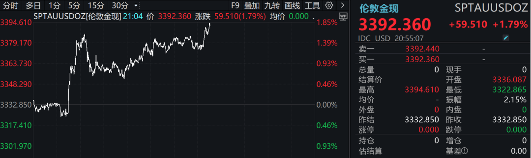 消息发布后,现货黄金短线拉升,一度突破3390美元关口。
