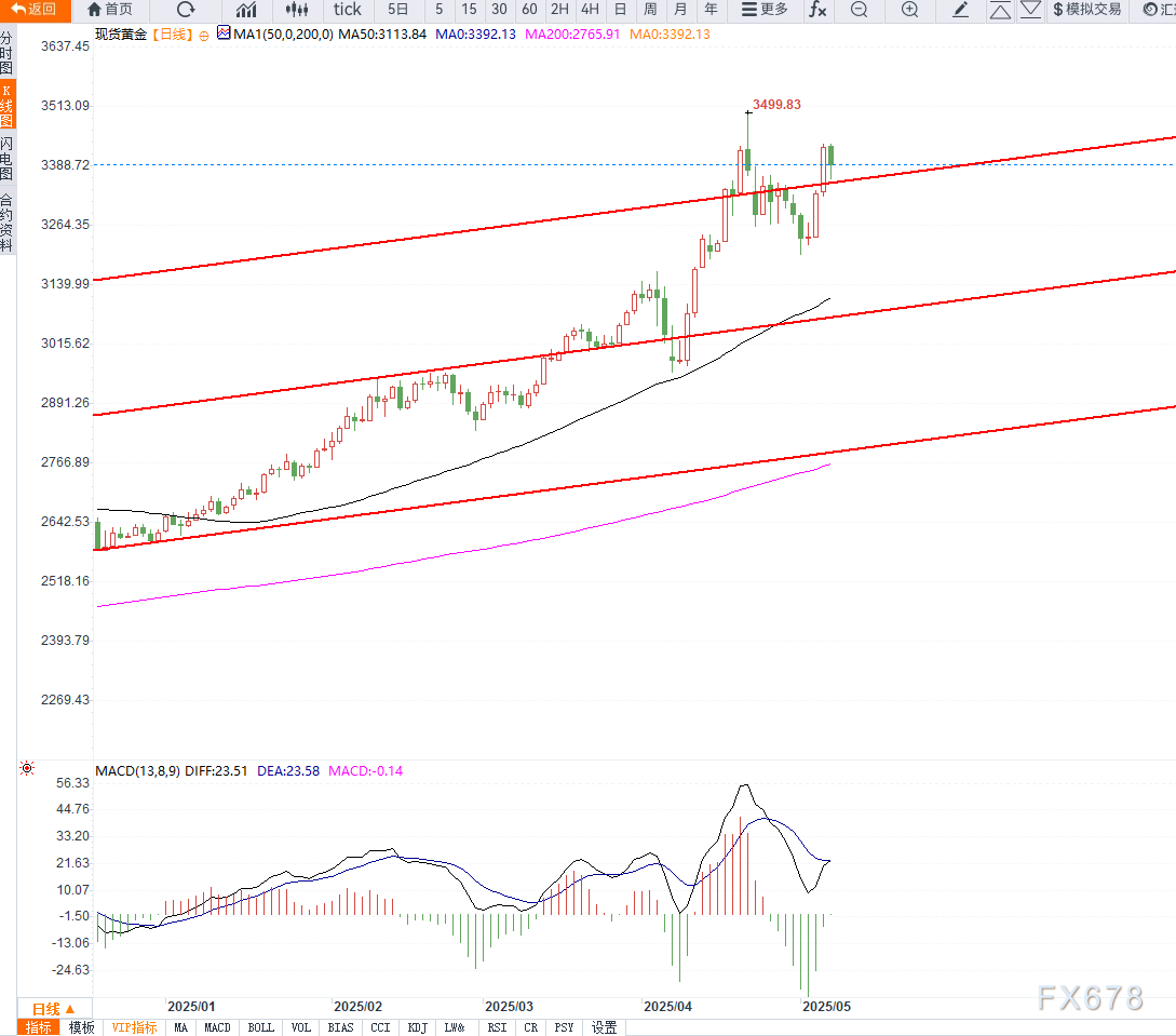 从黄金日线图形走势来看,价格在连续两日强劲反弹后,有所回落,显示上方抛压明显,短期内有技术性调整需求。当前价格回落至3400美元附近,为前期突破缺口的支撑区域,一旦失守,可能进一步回测3350美元水平。