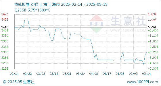 5月15日,生意社热轧板卷基准价为3313.33元/吨,与本月初(3276.67元/吨)相比,上涨了1.12%。
