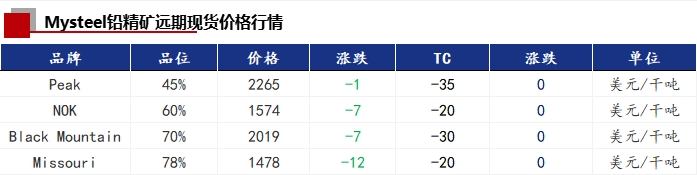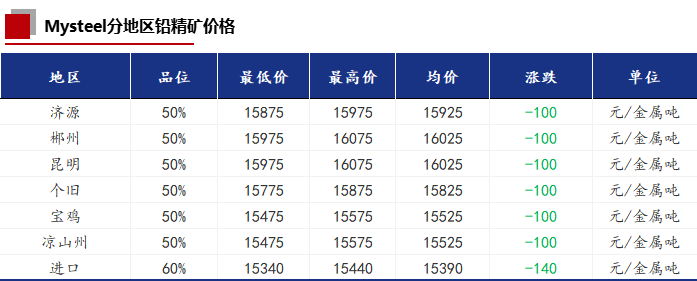 今日国内铅精矿加工费各地区均未调整,和上一交易日持平。受铅价的影响,铅精矿价格较上一交易日跌100元/金属吨。进口铅精矿价格下降140元/金属吨。