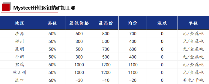 西南地区:云南某铅锭生产企业50品位的铅精矿加工费600元/金属吨到厂,铅精矿加工费暂无调整。