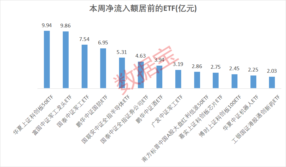 从资金流向来看,本周共计31只ETF净流入额在1亿元以上。华夏上证科创板50ETF、富国中证军工龙头ETF净流入额均超过9亿元;国泰中证军工ETF、鹏华中证国防ETF、国联安中证全指半导体ETF净流入额在5亿元以上。