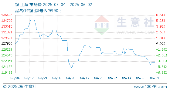 6月2日,生意社镍基准价为122425.00元/吨,与本月初持平。
