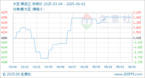 6月2日,生意社大豆基准价为4260.00元/吨,与本月初持平。