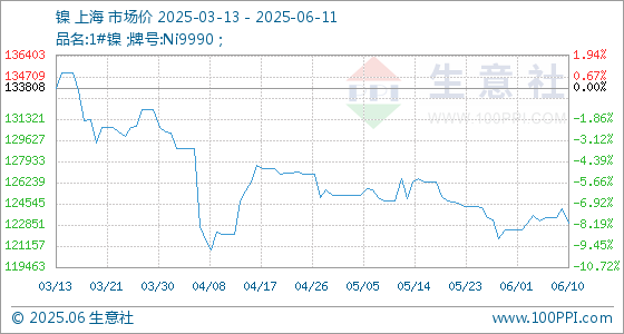 6月11日,生意社镍基准价为123000.00元/吨,与本月初(122425.00元/吨)相比,上涨了0.47%。