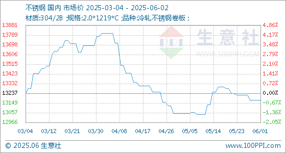 6月2日,生意社不锈钢基准价为13175.00元/吨,与本月初持平。