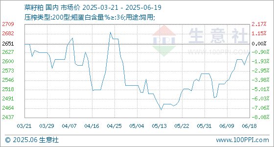 6月19日,生意社菜籽粕基准价为2630.00元/吨,与本月初(2565.00元/吨)相比,上涨了2.53%。