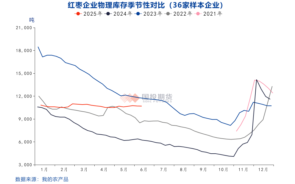 当前处于红枣消费淡季,鲜果消费为主流,干果消费普遍下滑,红枣的消费整体仍偏疲弱。从钢联数据统计的库存来看,目前红枣库存仍较为充裕,大幅高于去年同期水平。产区天气仍在变化,后续二茬花及坐果情况仍有待观察,警惕短期天气因素摇摆带来的价格高波动风险,建议多单小幅减持。