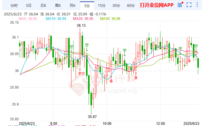 今日周一(6月23日)亚盘时段,现货白银目前交投于35.87一线上方,今日开盘于36.02美元/盎司,截至发稿,现货白银暂36.01美元/盎司,上涨0.06%,最高触及36.13美元/盎司,最低下探35.81美元/盎司,目前来看,现货白银盘内短线偏向看涨走势。