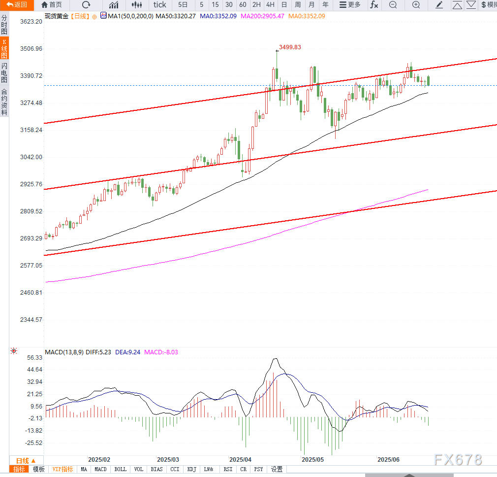 短线来看,金价若未能突破3400美元,则震荡整理格局将延续,重点关注通道支撑的得失。密切留意全球PMI数据及美伊局势进展,谨防技术面破位后加剧调整。