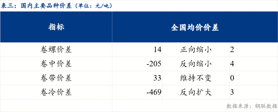 从品种价差来看,卷螺差较上一交易日正向缩小2元/吨,热中价差较上一交易日反向缩小4元/吨,热带价差较上一交易日维持不变,热冷价差较上一交易日反向扩大3元/吨。