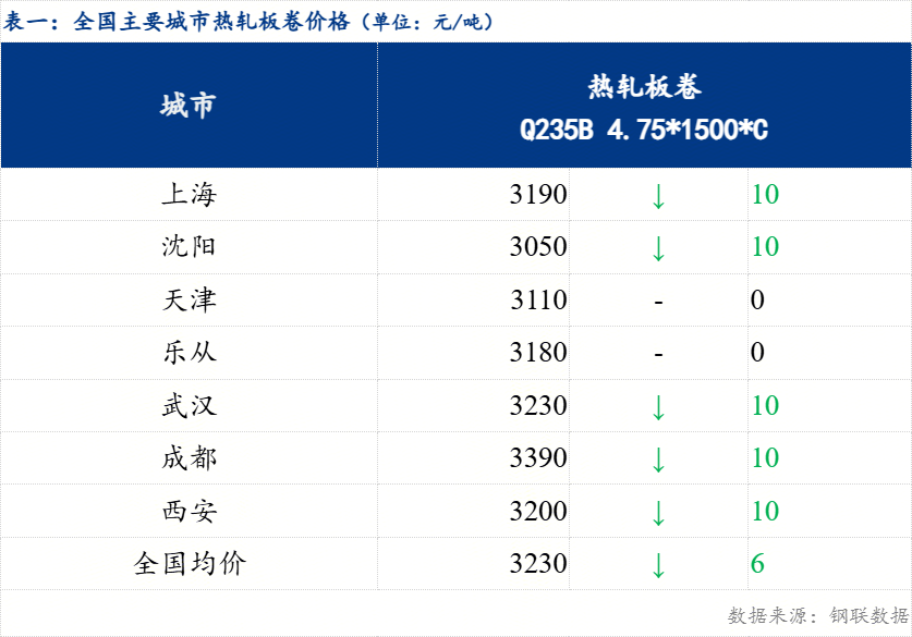 今日热轧板卷全国主要城市价格小幅下跌,截止发稿时3.0mm热轧板卷全国均价3287元/吨,较上一交易日下跌6元/吨;4.75mm热轧板卷全国均价3230元/吨,较上一交易日下跌6元/吨。分区域来看,今日各区域基本持稳或小幅下行,下跌幅度在0-20元/吨左右。今日黑色商品期货弱势运行,10合约收跌0.16%,期货市场弱势震荡运行,部分市场早盘现货价格小幅下跌,午后盘面继续弱势真的那个,部分市场午后继续下调报价,全日成交情况一般。