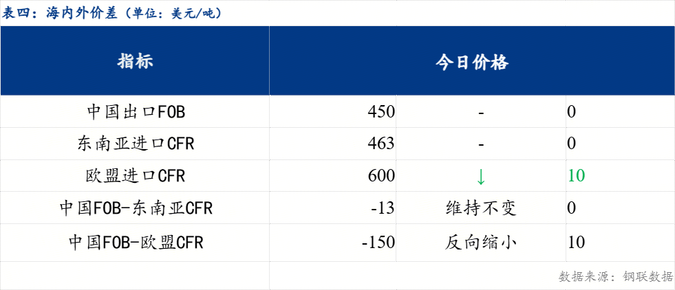 从海内外价差情况来看,中国热卷出口价格报450美元/吨左右,较上个交易日暂稳,欧盟进口价格600美元/吨,较上一交易日下跌10美元/吨。