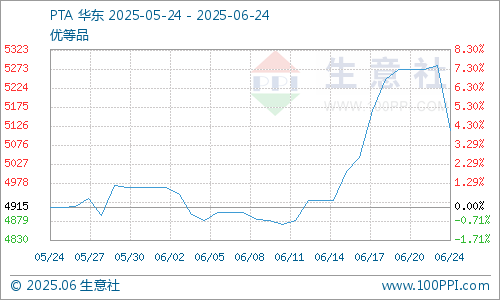 PTA市场跟跌原油,据生意社商品行情分析系统,6月24国内PTA现货市场行情重心下移,华东地区PTA市场均价在5114元/吨,单日跌幅3.18%。供应方面,逸盛大化360万吨产能降负50%、恒力石化220万吨检修,国内供应小幅萎缩。行业整体开工在78%附近。新产能虹港石化250万吨6月7日投料,提负中。