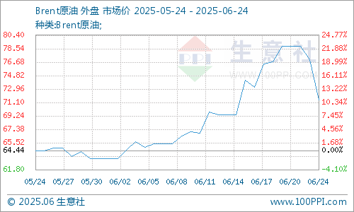 6月24日,国际原油期货重挫,创两周新低。美国WTI原油期货8月合约结算价报64.37美元/桶,跌幅4.14美元或6.0%。布伦特原油期货8月合约结算价报67.14美元/桶,跌幅4.34美元或6.1%。以色列和伊朗停火协议达成预期降低了中东地区石油供应中断的风险。