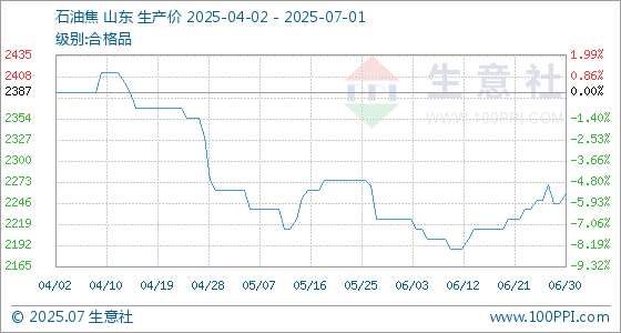 7月1日,生意社石油焦基准价为2257.50元/吨,与上月初(2225.00元/吨)相比,上涨了1.46%。