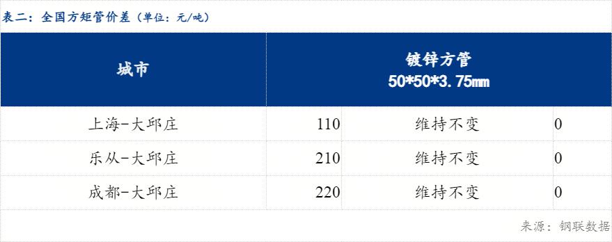 上海与大邱庄镀锌方管价差维持不变,乐从与大邱庄价差维持不变,成都与大邱庄价差维持不变。