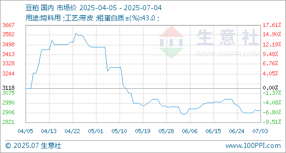 7月4日,生意社豆粕基准价为2930.00元/吨,与本月初(2906.00元/吨)相比,上涨了0.83%。