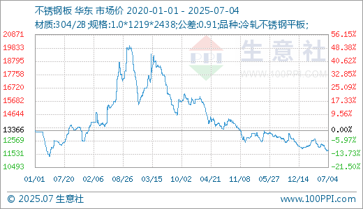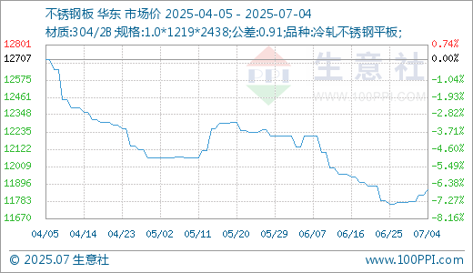 据生意社价格监测,本周不锈钢价格小幅上涨。截止7月4日,现货304/2B不锈钢平板1.0*1219*2438(公差0.91)的日均价为现报价11857.14元/吨,较周初上涨0.67%,同比下跌8.39%。