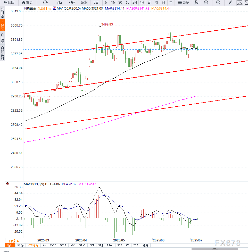 黄金市场短期虽出现技术性回落,但在美国贸易政策不确定性未消、地缘局势复杂的背景下,黄金仍将维持避险资产主导地位。关注7月9日前后美方动向,一旦谈判破裂或关税如期实施,避险需求将迅速反映至金价上行。