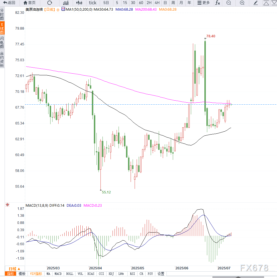 从日线图形来看,美国WTI原油价格在经历短暂反弹后,受阻于70美元整数关口,连续三个交易日收出上影线较长的K线形态,显示上方压力显著。当前价格运行在20日与50日均线下方,MACD指标出现死叉迹象,动能柱逐步缩短,显示多头动能减弱。