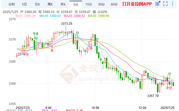 今日周五(7月25日)亚盘时段,国际黄金目前交投于3357.70美元附近,截至发稿,国际黄金暂报3359.85美元/盎司,跌幅0.24%,最高上探3373.25美元/盎司,最低触及3357.70美元/盎司。目前来看,国际黄金短线偏向看空走势。