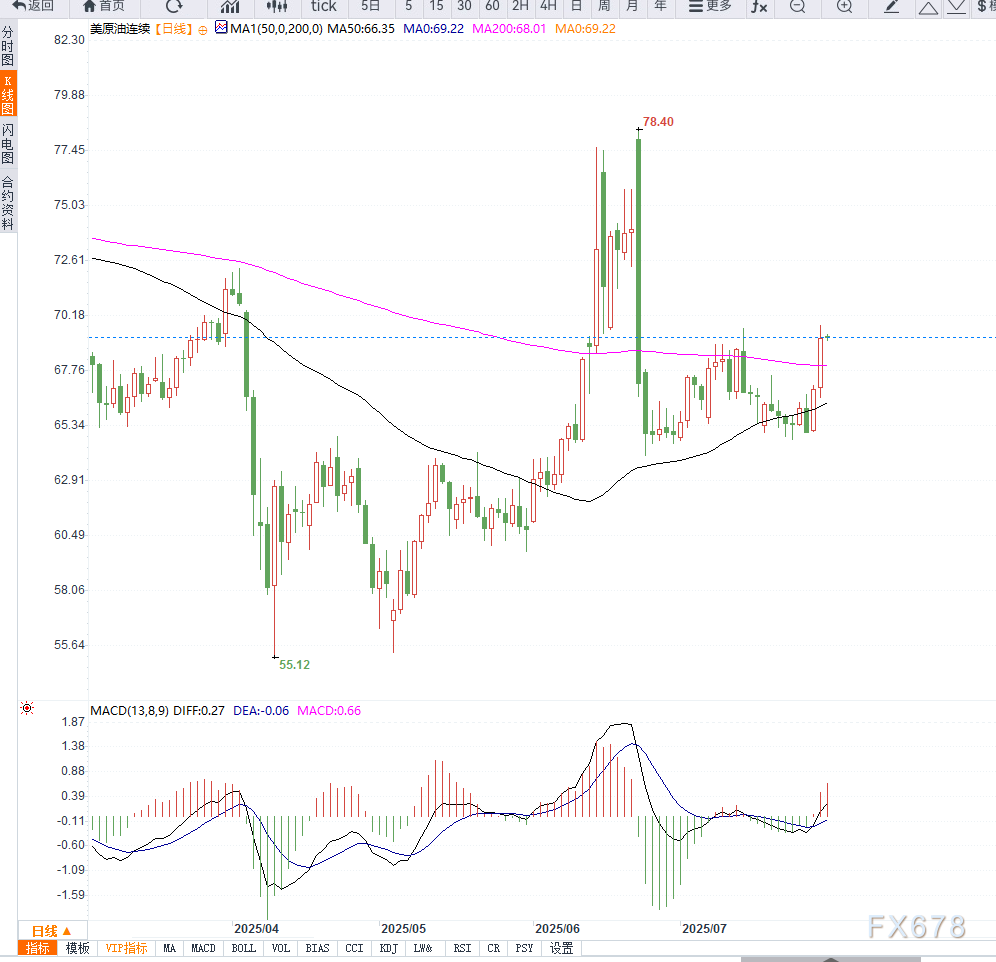 当前美原油(WTI)日线图显示,价格成功突破自6月以来的下降趋势线,并站稳在20日与50日均线上方,短期趋势已由弱转强。技术指标方面,MACD快慢线形成金叉,动能柱持续放大,RSI指标位于62附近但未进入超买区间,显示上涨动能仍具延续性。