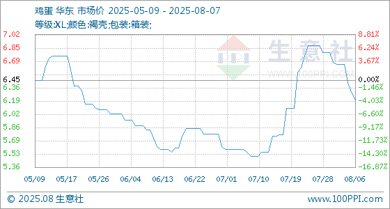 8月7日,生意社鸡蛋基准价为6.20元/公斤,与本月初(6.67元/公斤)相比,下降了7.05%。