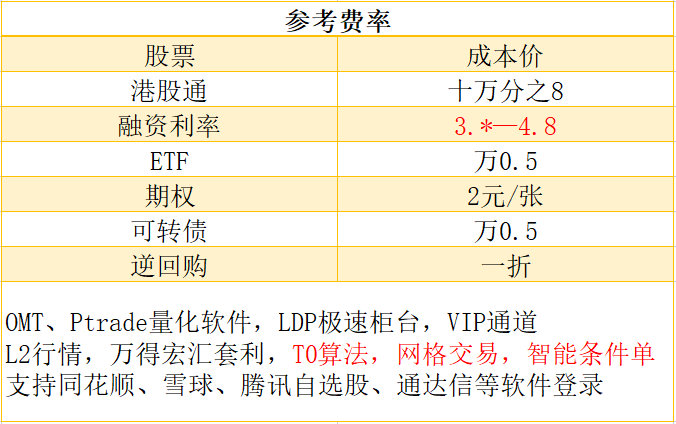 佣金成本价,专项两融利率4.0,免费提供量化软件qmt和ptrade,VIP通道&独立席位,加经理联系方式咨询!!!