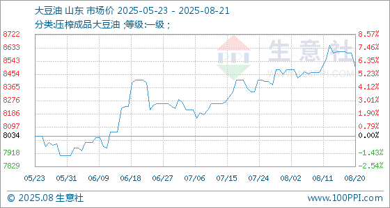 8月21日,生意社大豆油基准价为8498.00元/吨,与本月初(8454.00元/吨)相比,上涨了0.52%。