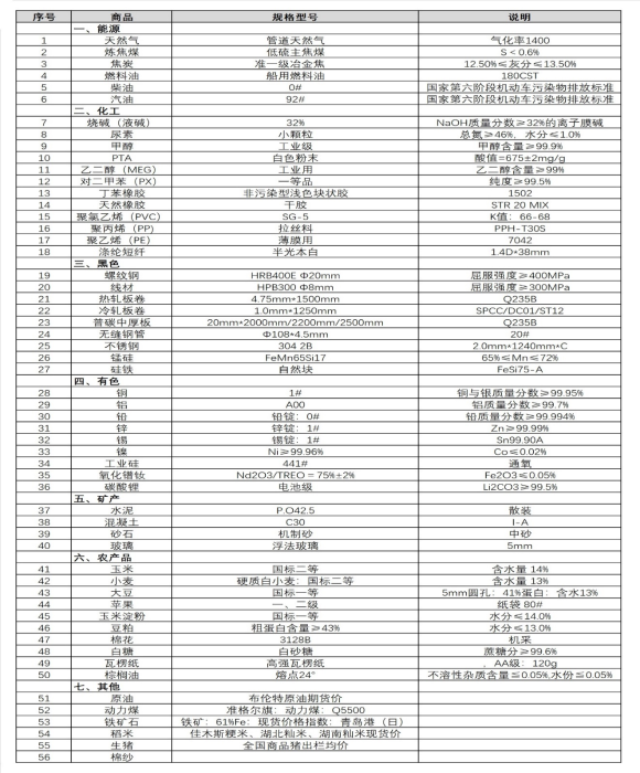 本表所示大宗商品价格(类别与产品规格说明见附表)为以人民币计价的现货价格(包含流通费用、利润和税费等)。计算这些价格时使用的信息来源,主要包括国内重点地区的生产商、贸易商及下游消费企业之间的成交、询报盘及可成交价格。价格单位为人民币元/吨。