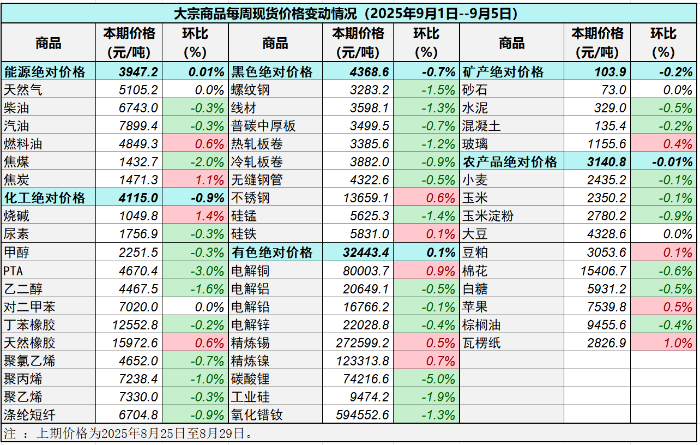 据中国物流与采购联合会对全国50种重要大宗商品市场价格调查显示,本期价格(2025年9月1日至9月5日)与上期价格相比,,13种(占比26%)大宗商品价格上涨, 33种(占比66%)价格下跌, 4种(占比8%)价格持平。
