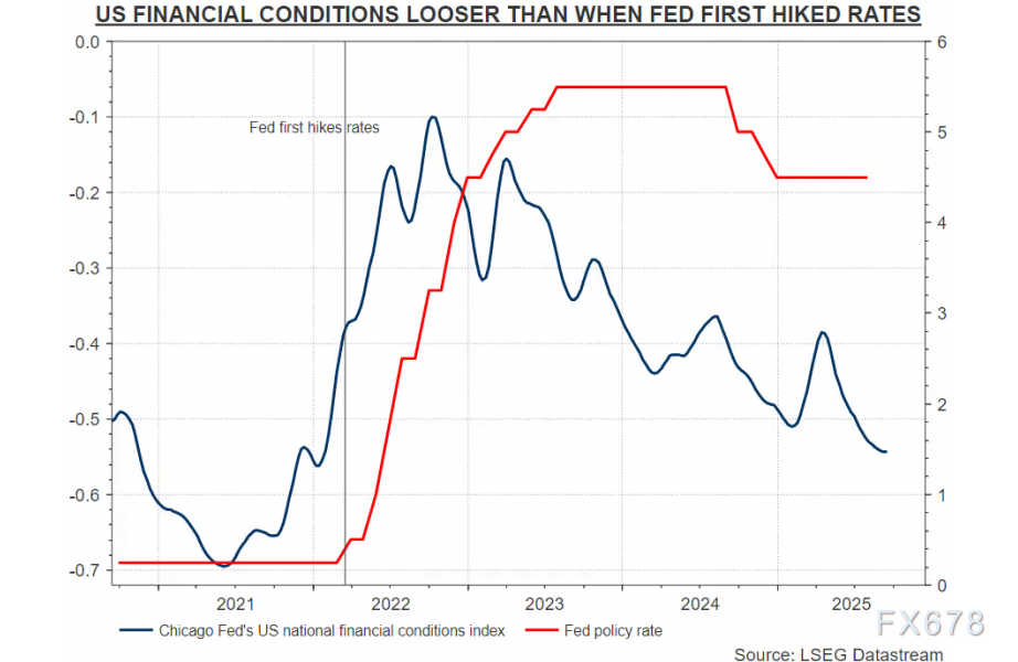 另一方面,无论贸易关税的持久影响如何,美国零售销售仍同比增长5%,股市飙升至历史新高,整体金融状况为三年来最宽松,通胀继续高居美联储目标之上。