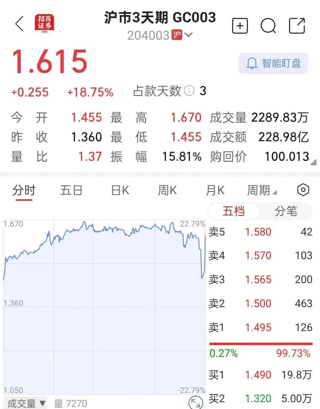 9月22日,国债逆回购普遍上扬。其中1天期、2天期、3天期的国债逆回购盘中涨幅一度超过20%。
