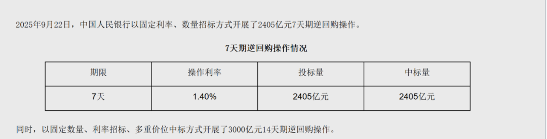 9月22日,中国人民银行发布公告称,当日,中国人民银行以固定利率、数量招标方式开展了2405亿元7天期逆回购操作。同时,以固定数量、利率招标、多重价位中标方式开展了3000亿元14天期逆回购操作。