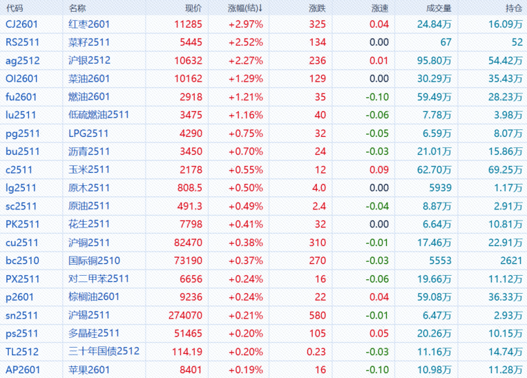 9月26日,午盘收盘,国内期货主力合约互有涨跌。红枣涨近3%,沪银涨超2%,燃料油、菜油、低硫燃料油(LU)涨超1%。跌幅方面,焦炭、焦煤跌超2%,集运欧线、铁矿石、螺纹钢跌超1.5%。