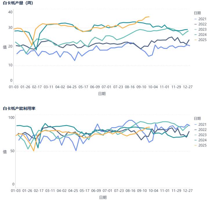 白卡纸9月销量较好,生产企业周均销量33.8万吨,较8月周均30.5万吨平均每周销量高3.3万吨。9月白卡纸价格处于同期低位,产销增幅明显。10月初假期临近,企业多有放假,预计10月白卡纸产销较9月有所下滑。但在元旦、春节等旺季预期下,10月白卡纸需求仍有较好预期。