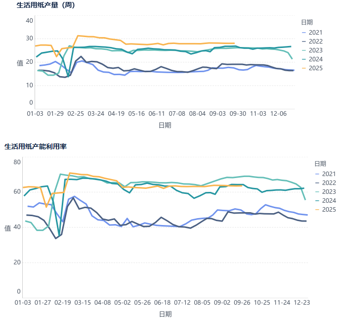 生活用纸8月产量124.37万吨,较上月增加0.67万吨。产量同比处于近五年高位水平,产能利用率为65.68%,环比增加0.38个百分点,9月周度产能利用率平均值为63.6%,处于年内平均水平,高于去年同期水平。8月中国生活用纸出口14.76万吨,环比降2.76%,同比增28.78%。