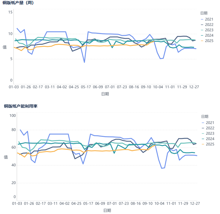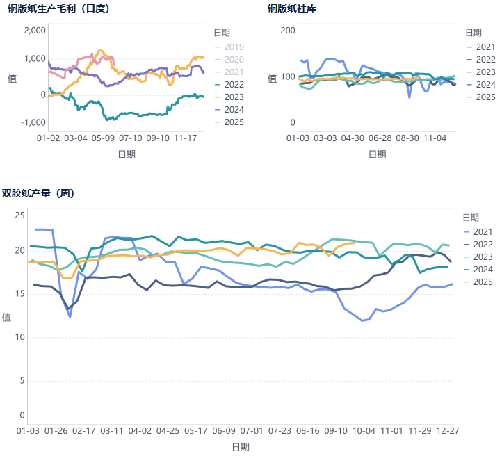 铜版纸8月有效产能53.75万吨,产量34.48万吨,环比上月减少0.07万吨,同比处于历史低位;产能利用率为57.47%,同比处于历史低位。至9月26日,铜版纸生产企业库存可用天数21.55天,较8月末环比上涨,同比处于低位水平。贸易商库存持续下滑。8月成本处于同期低位,铜版纸生产成本在4808元/吨左右,低于往年同期。