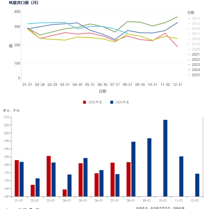 1、供应方面,尽管8月纸浆进口量还同比下滑,但1-8月累计同比增幅依然明显,国产浆产能提升产量增加。