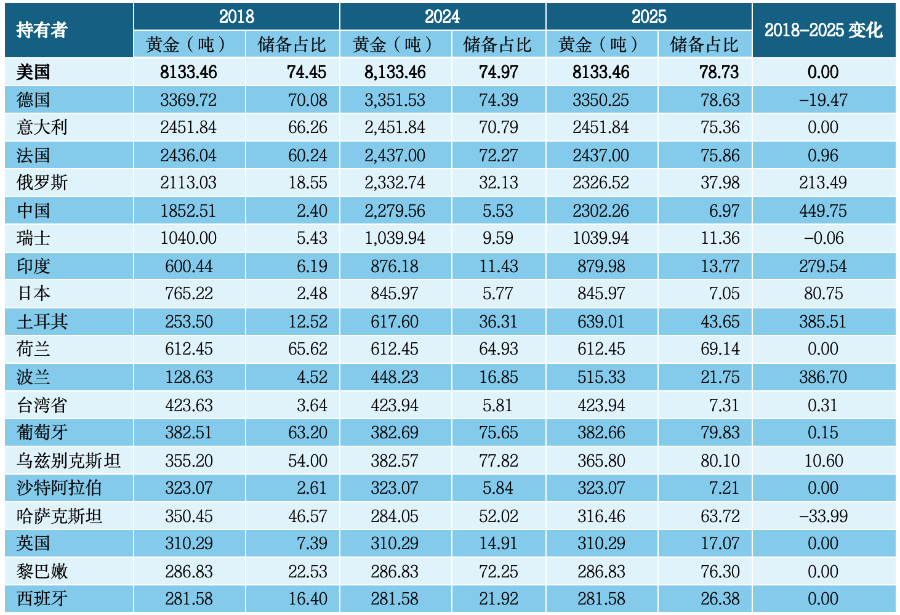 对于其他主要国家的央行而言,黄金储备有利于分散储备风险,维持本国币值稳定,因此黄金储备十分重要。2008年以来,包括新兴市场经济在内的国家和地区开始重视外汇储备管理,不再单纯依靠增持美国国债,而是逐步奉行多元化管理政策,并提高黄金储备占比。与2018年末相比,2025年8月,中国、波兰、土耳其、印度和俄罗斯分别大幅增持了449.75吨、386.70吨、385.51吨、279.54吨和213.49吨黄金,合计1714.99吨;作为七国集团成员,日本也增持了80.75吨。