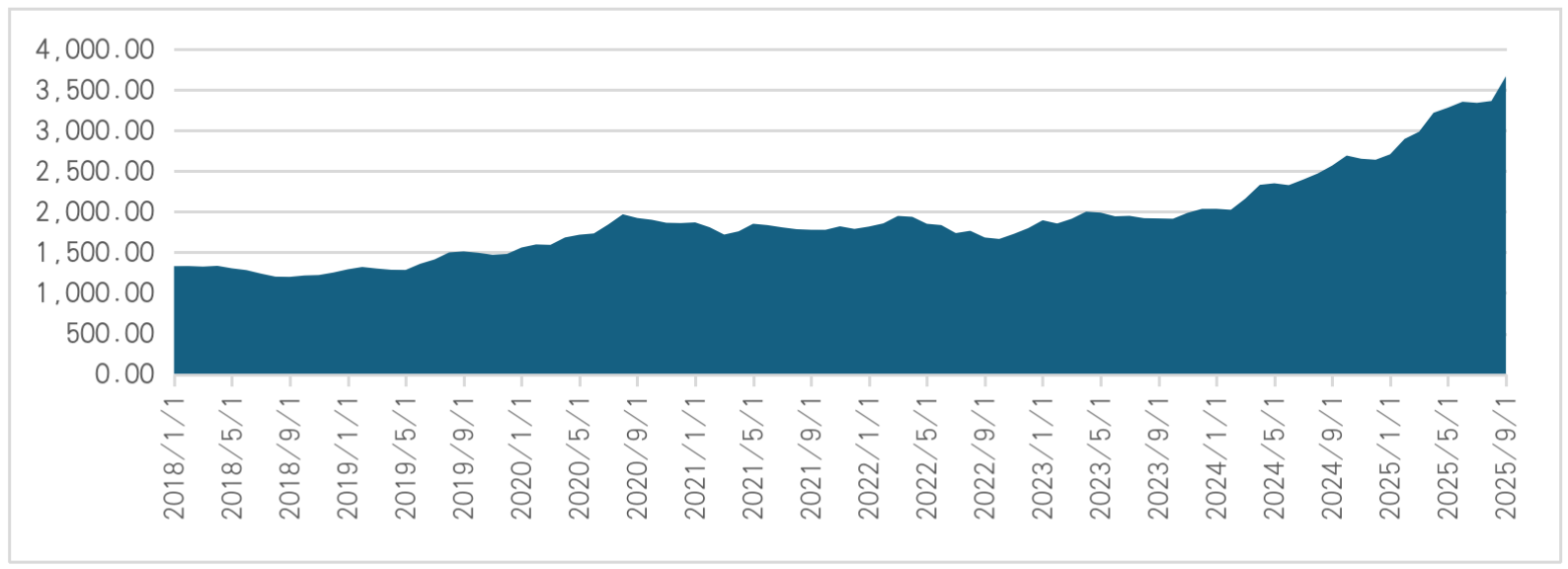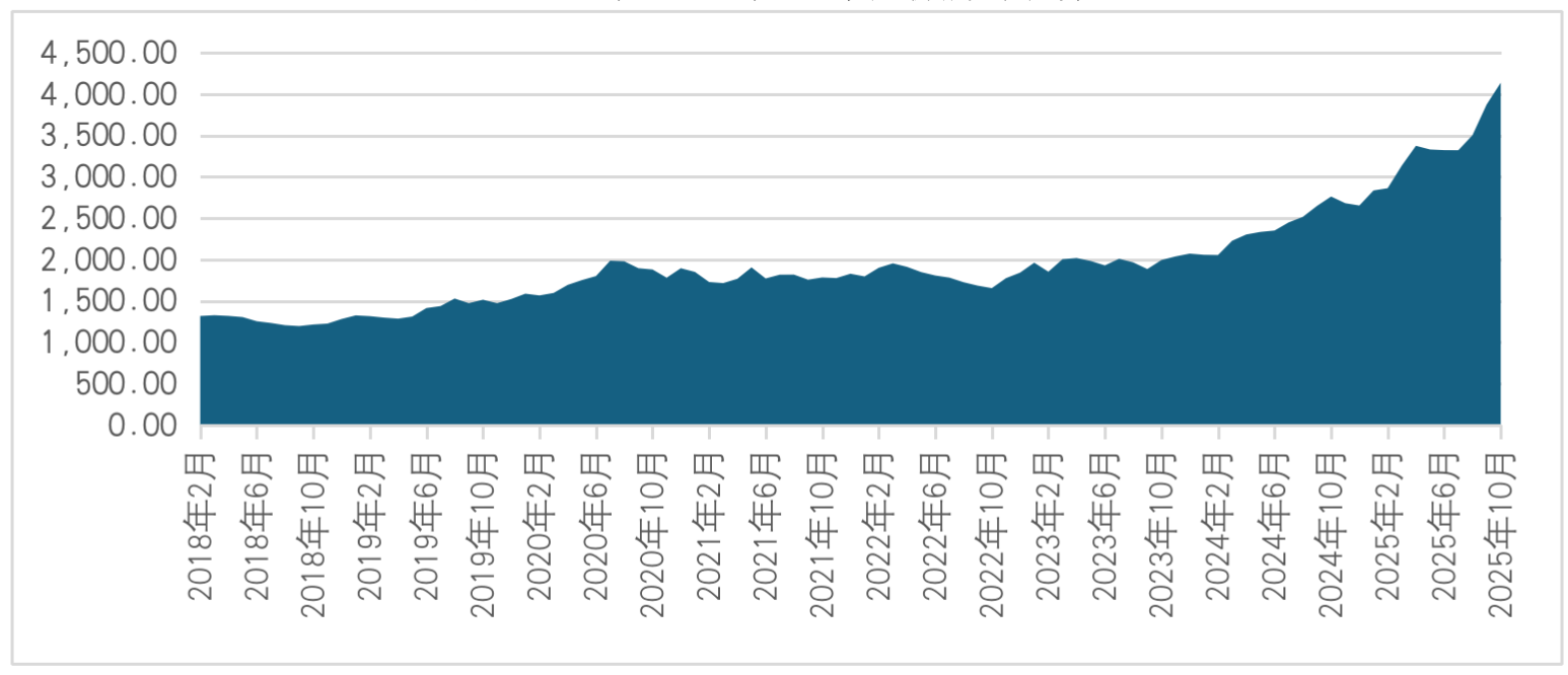 图2 2018-2025年黄金ETF持有的黄金(吨)的变化趋势