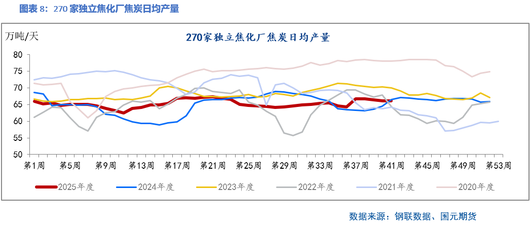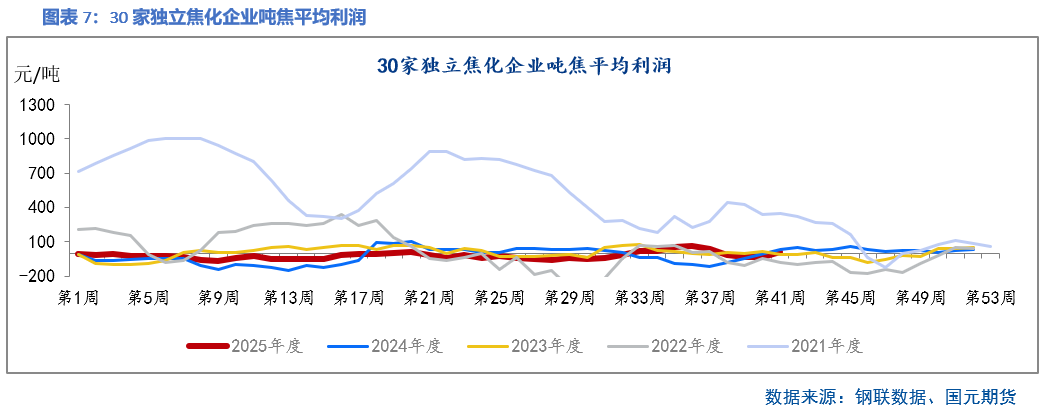 上周,230家样本独立焦化厂焦炭日均产量为52.86万吨/天,周环比下降0.06%;270家样本独立焦化厂焦炭日均产量为66.12万吨/天,周环比增加0.06%;247家钢厂焦化厂日均产量46.38万吨/天,周环比下降0.34%。独立焦化厂吨焦利润为9.0元/吨,周环比增加45.0元/吨。