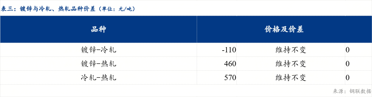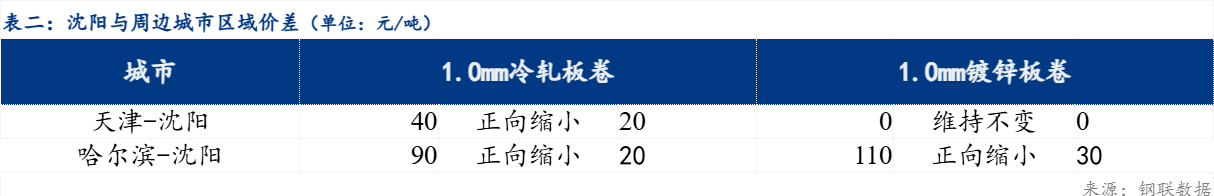区域价差来看,天津-沈阳冷轧板卷区域价差缩小20元/吨,沈阳-哈尔滨冷轧板卷区域价差缩小20元/吨;天津-沈阳镀锌板卷区域价差维持不变,沈阳-哈尔滨镀锌板卷区域价差缩小30元/吨。品种价差来看,镀冷品种价差维持不变;镀热品种价差维持不变;冷热品种价差维持不变 。