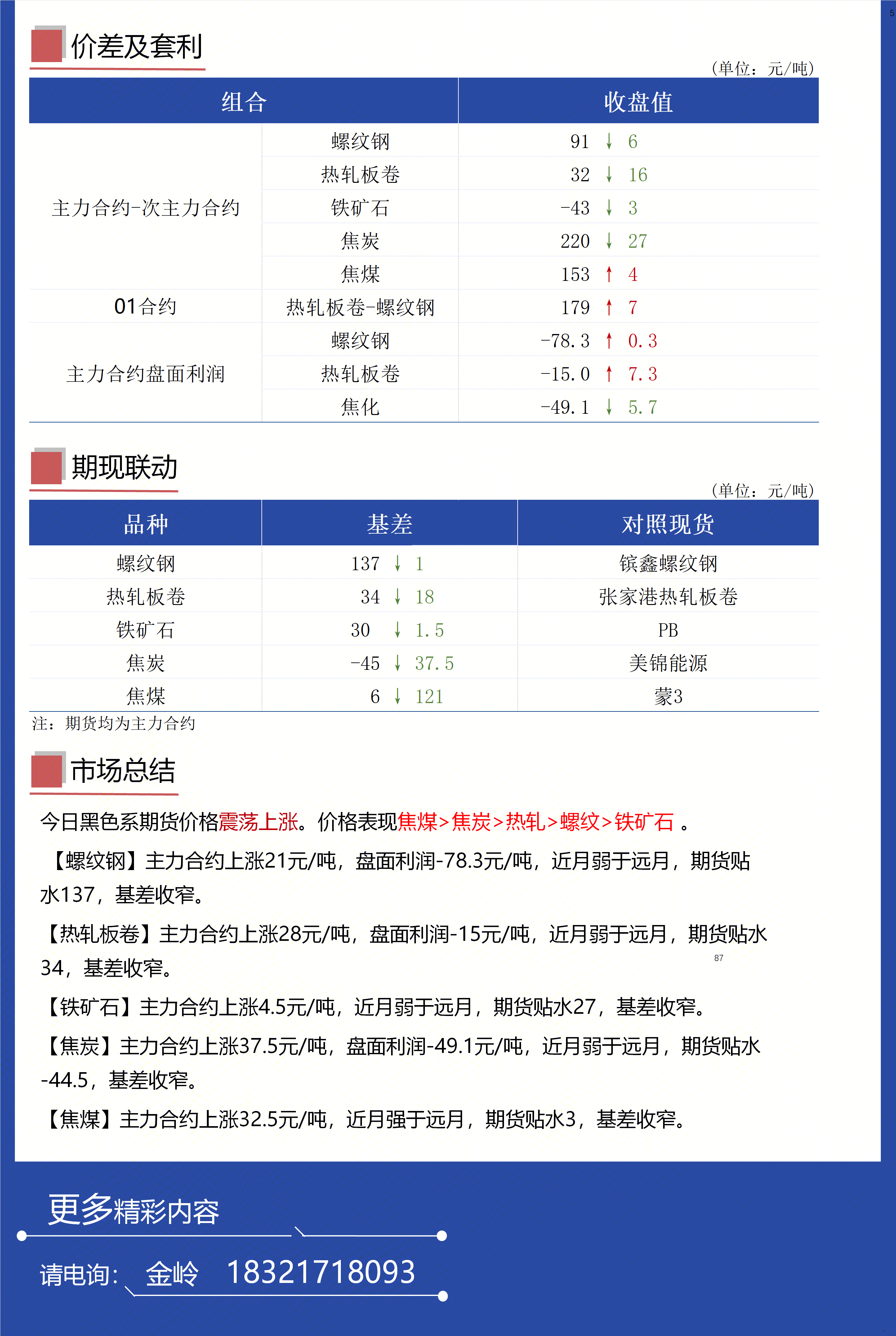 今日黑色系期货价格震荡上涨。价格表现焦煤>焦炭>热轧>螺纹>铁矿石 。 【螺纹钢】主力合约上涨21元/吨,盘面利润-78.3元/吨,近月弱于远月,期货贴水137,基差收窄。【热轧板卷】主力合约上涨28元/吨,盘面利润-15元/吨,近月弱于远月,期货贴水34,基差收窄。【铁矿石】主力合约上涨4.5元/吨,近月弱于远月,期货贴水27,基差收窄。【焦炭】主力合约上涨37.5元/吨,盘面利润-49.1元/吨,近月弱于远月,期货贴水-44.5,基差收窄。【焦煤】主力合约上涨32.5元/吨,近月强于远月,期货贴水3,基差收窄。