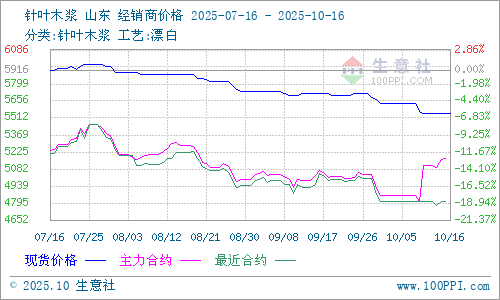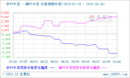 据生意社商品行情分析系统:近期针叶木浆和阔叶木浆价格呈现背道而驰之势,针叶浆弱势下行,阔叶浆坚挺上浮。截止10月16日,山东地区针叶木浆市场均价为5550元/吨,与10月1日均价相比下降1.48%;阔叶木浆市场均价为4250元/吨,与10月1日均价相比上涨0.39%。