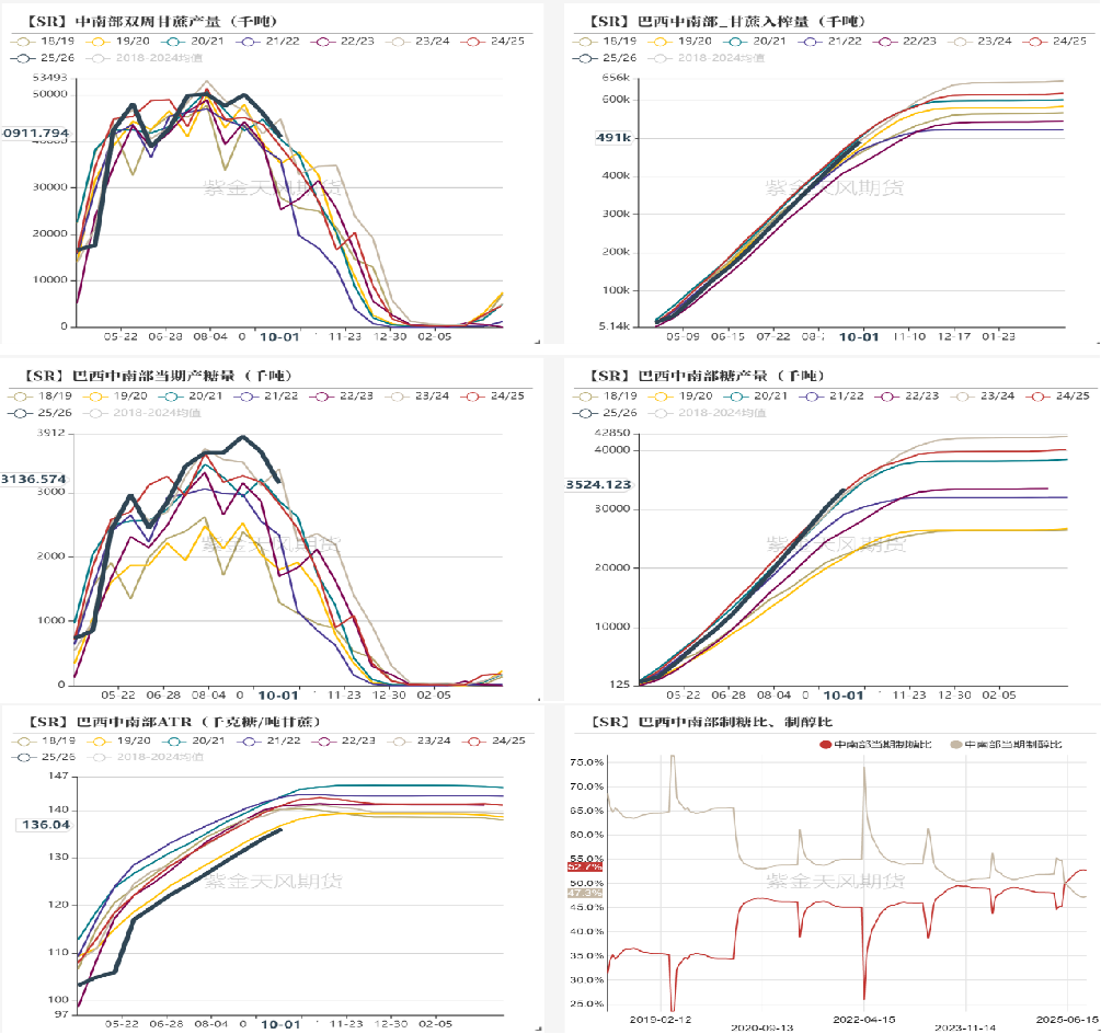 2025/26榨季截至9月下半月,巴西中南部地区累计入榨量为49092.6万吨,同比降幅达2.99%;甘蔗ATR为136.04kg/吨,较去年同期的141.16kg/吨减少5.12kg/吨;累计制糖比为52.68%,较去年同期的48.84%增加3.84%;累计产糖量为3352.4万吨,较去年同期的3324.4万吨增加28万吨,同比增幅达0.84%。