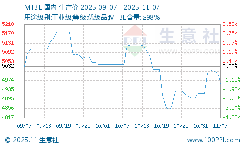 据生意社商品行情分析系统,11月3日至7日,MTBE价格自5002元/吨先涨后跌至4960元/吨,周期内价格小跌0.85%,环比下跌1.64%,同比下跌5.94%。下游客户阶段性补库,MTBE厂家库存压力得到缓解,存有一定挺价意愿。装置开工率保持高位,前期部分停工厂家逐步恢复生产,资源供应呈窄幅增长态势,MTBE行情偏弱整理。